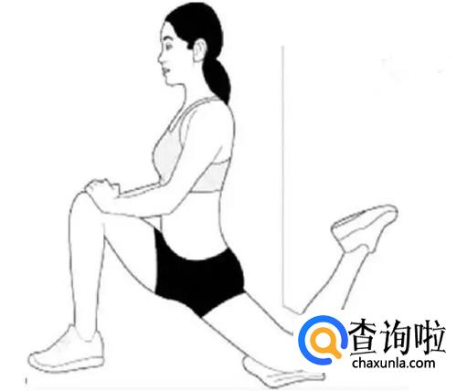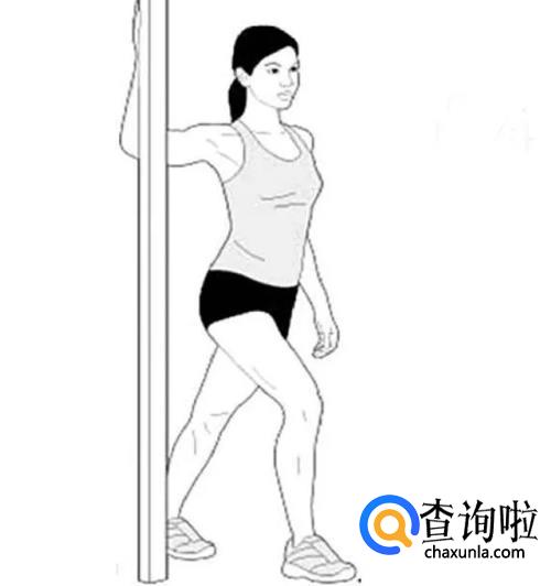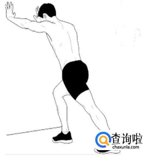 站在离墙约60厘米远处,右腿在前屈膝,左腿在后伸直,两臂伸直,双手扶墙;