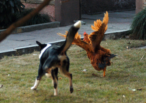 在动物园,经常看见孔雀开屏, 动物学工作者认为,大红大绿的服色,游客的大声谈笑,可以刺激孔雀,引起它们的警惕戒备。这时孔雀开屏,也是一种示威、防御的动作。凡是注意观察自然各种现象的人,都会注意到,当猎食动物如鹰、黄鼠狼等向带着鸡雏的母鸡进攻时,母鸡也会竖起它的羽毛和敌害作斗争。这种动作只是它们的一种防御反应。孔雀受惊时的开屏动作也是如此。