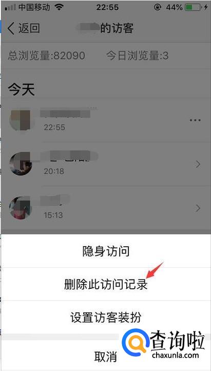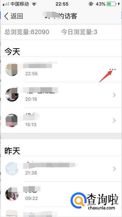 点击进去访客功能,会发现第一个访客就是我们自己,再点击右边的小圆点。