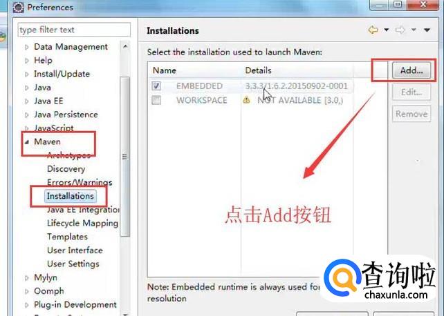 然后在弹出的Preferences界面中选择Maven下面的Installations选项,接着点击Add按钮,如下图所示