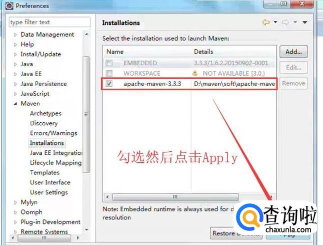然后在Preferences界面中勾选新添加的maven环境,点击Apply按钮,如下图所示