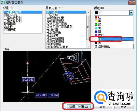 在弹出的“图形窗口颜色”选项框中,把颜色由默认的黑色改成白色,点击“应用并关闭”按钮。