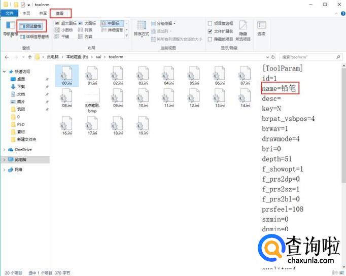 导入完毕后,可能会存在同名的笔刷,可以在文件夹中查看同名笔刷是否为同一类,如果是删除一个就好,如果不是改掉其中一个的名字即可。不进行这一步的话,在使用sai笔刷的时候可能会看到两个一模一样的笔刷,若不介意则可以忽略这一步。如图所示显示预览窗格(windows10系统下),这可以看到文件的大致信息。“name”信息一致即为相同笔刷,不一致则不同。