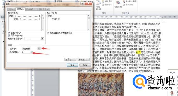 最后单击引用选项卡中的目录按钮,再选择下面的插入目录选项,可以通过显示级别来确定想要目录出现的级别,也可以选择不同的格式。