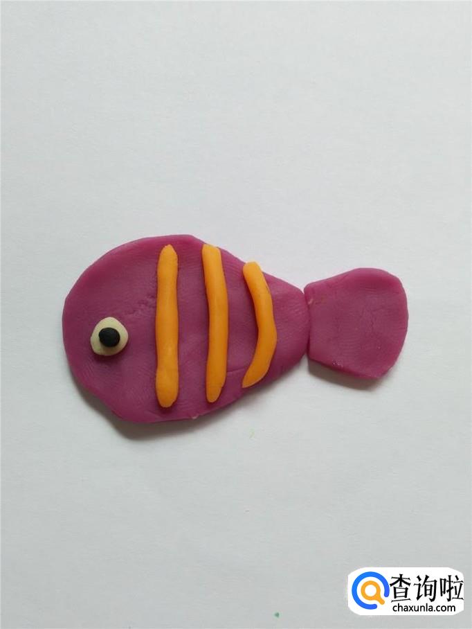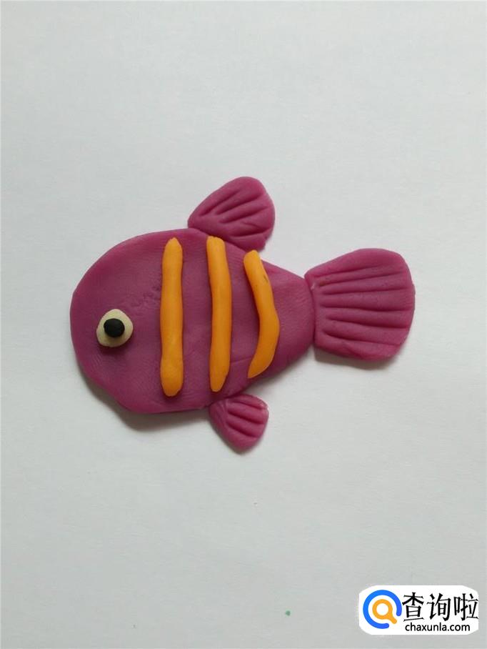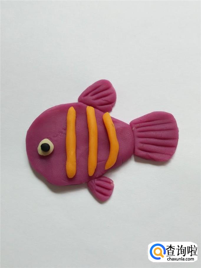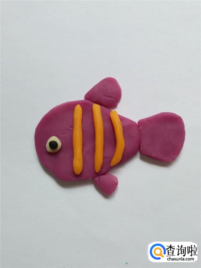 再用紫色捏一大一小两个小三角形,大的粘在鱼的身体上面,当作背鳍,小的粘在鱼的身体下面,当作腹鳍。