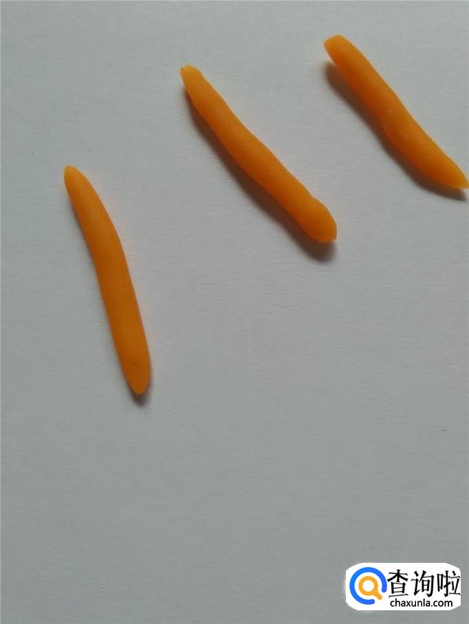 用桔黄色搓三个细长条,粘在小鱼的身体上面,当作鱼身上的花纹。