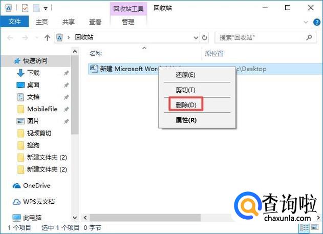 弹出的界面,我们又看到了刚刚的那个文件了,我们右击选择删除;