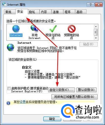 进入Internet属性窗口后我们点击“安全”栏目,点击“自定义级别”进入。