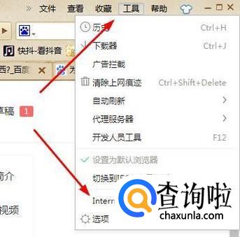 首先我们打开浏览器,然后在浏览器的右上角点击“工具”展开菜单栏,选择“Internet选项”进入。