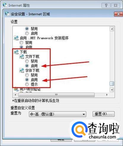 进去安全设置窗口后我们下拉找到“下载”的栏目,勾选启用“文件下载”和“字体下载”。