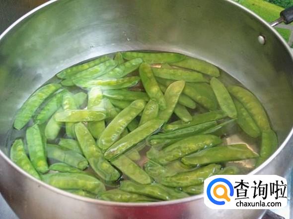 然后我们将洗干净的荷兰豆放入烧开的水进行烫熟到七八分熟后捞出沥干。