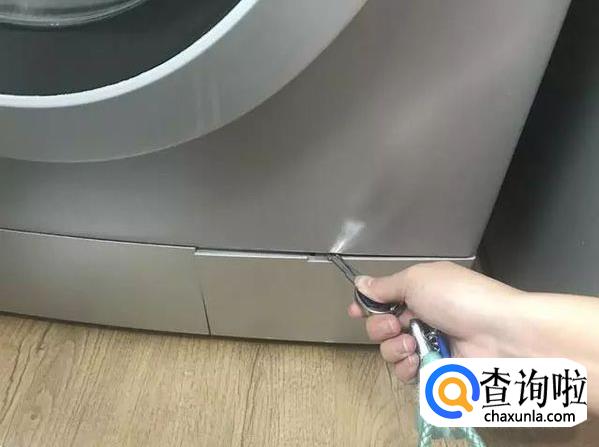 在清理之前,首先要确定洗衣机是在关闭的状态。然后只需要用小工具(铁片、螺丝刀)把挡板撬开,打开之后,就能看到一根小水管和一个圆形的小盖子;