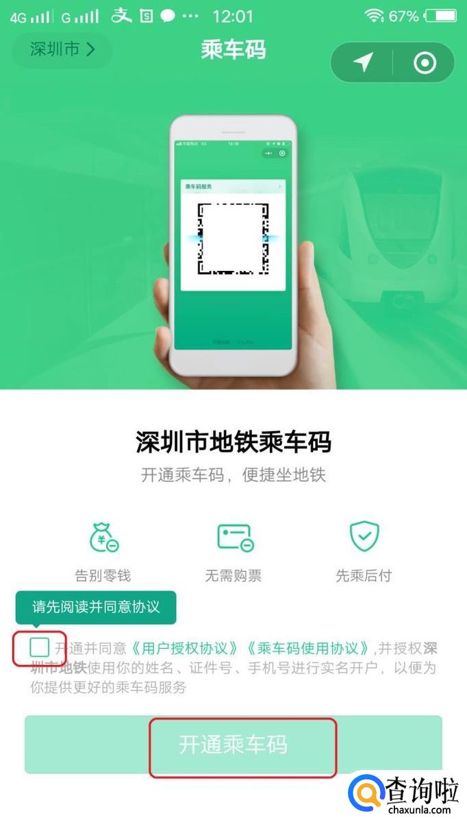 如图所示,我们需要阅读并同意协议,然后点击“开通乘车码”。