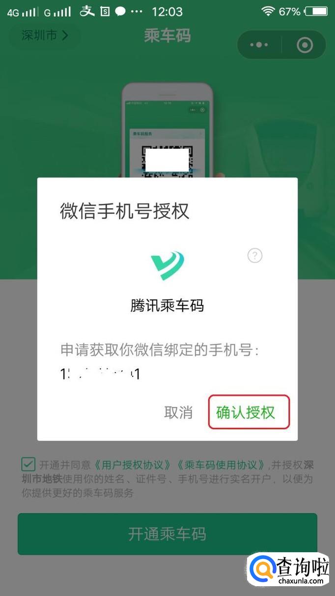 会有一个手机号验证的环节,我们点击“确认授权”,输入验证码后,就可以开通乘车码服务了。