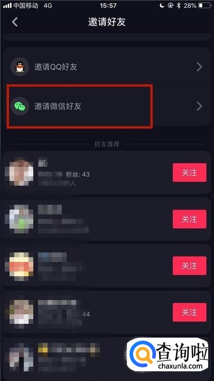 如果你想添加微信好友,可以点击邀请微信好友。当好友同意你的邀请,加入到抖音,那么你就会自动关注他的抖音号了。