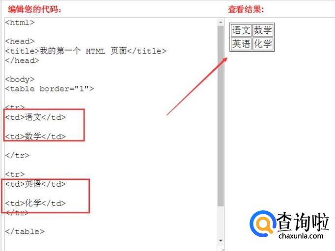 HTML表格的单元格用<td>标签表示,如下图所示: