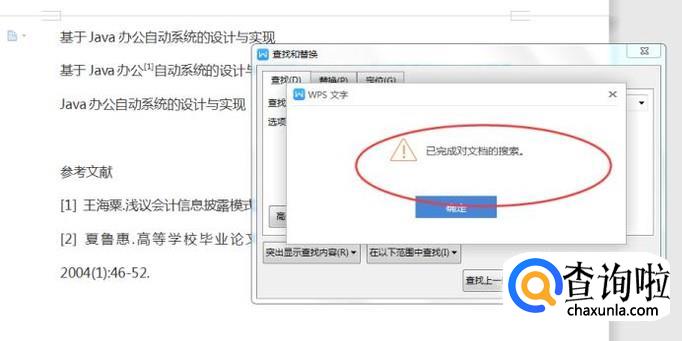 然后一直点击【查找下一处】,直到文档结束后,会显示已完成对文档的搜索,如下图所示: