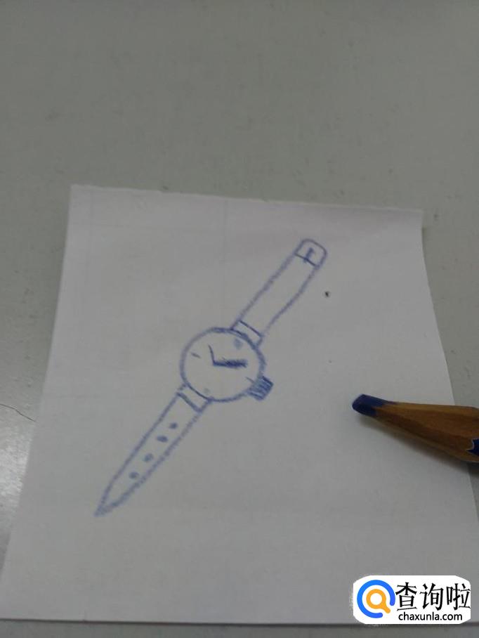 在表盘上下方画一条末端尖尖的长条形,在表盘的上方,画一个长方形,这两个长条,表示表带。