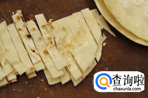 烙好的饼切成条,备用。