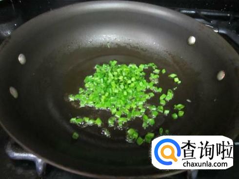 然后,放入葱花,爆香,放入圆白菜条和胡萝卜丝,加入适量盐,翻炒。