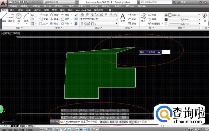 如图所示,命令窗口显示"MEASUREGEOM 指定下一个点或[圆弧(A)长度(L)放弃(U)总计(T)]"。依次拾取测量对象的下一个点,鼠标左键确认。