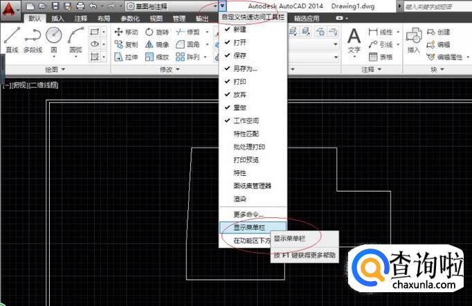 启动AutoCAD 2014辅助设计软件,如图所示。点击自定义快速访问工具栏向下箭头。弹出下拉列表选择"显示菜单栏"项。