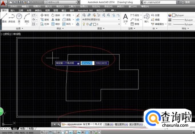 命令窗口显示"MEASUREGEOM 指定第一个角点或[对象(O)增加面积(A)减少面积(S)退出(X)]",如图所示。拾取测量对象的第一个角点,鼠标左键确认。