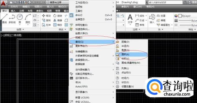 如图所示,唤出"系统菜单栏"区。点击"工具→查询"子菜单向右箭头,弹出级联菜单选择"面积"项。