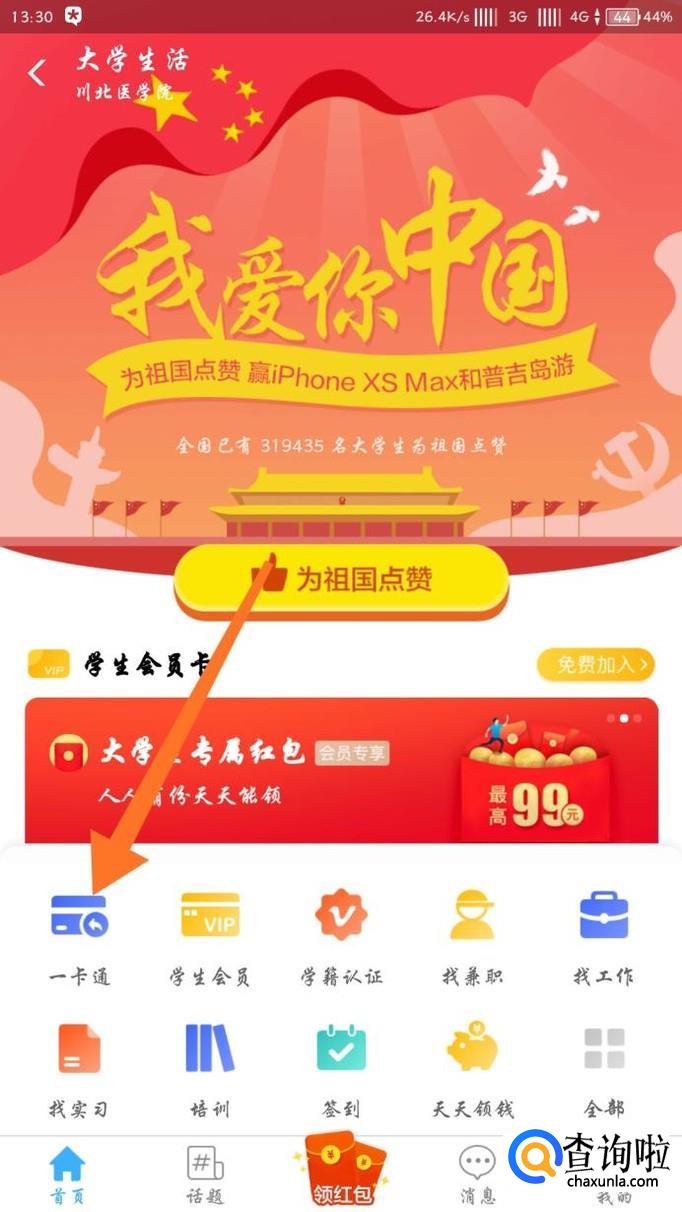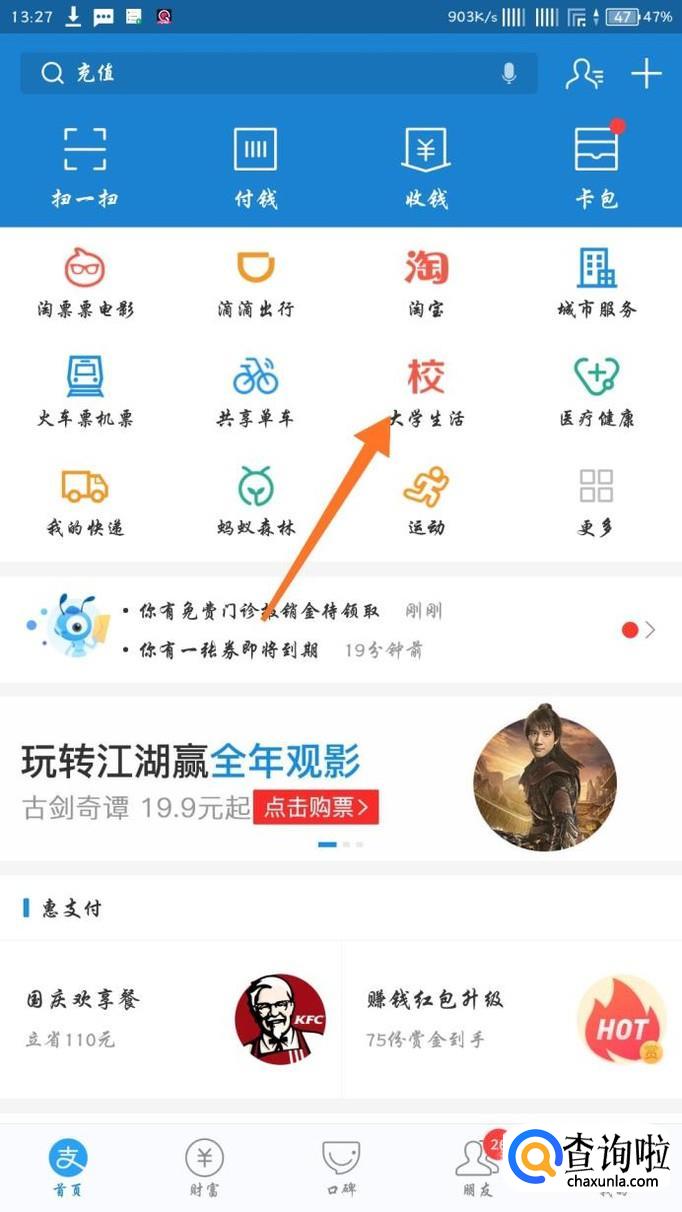 打开手机的支付宝,如果没有就注册一个,点击主页的“大学校园”,如图所示。