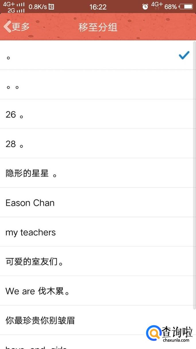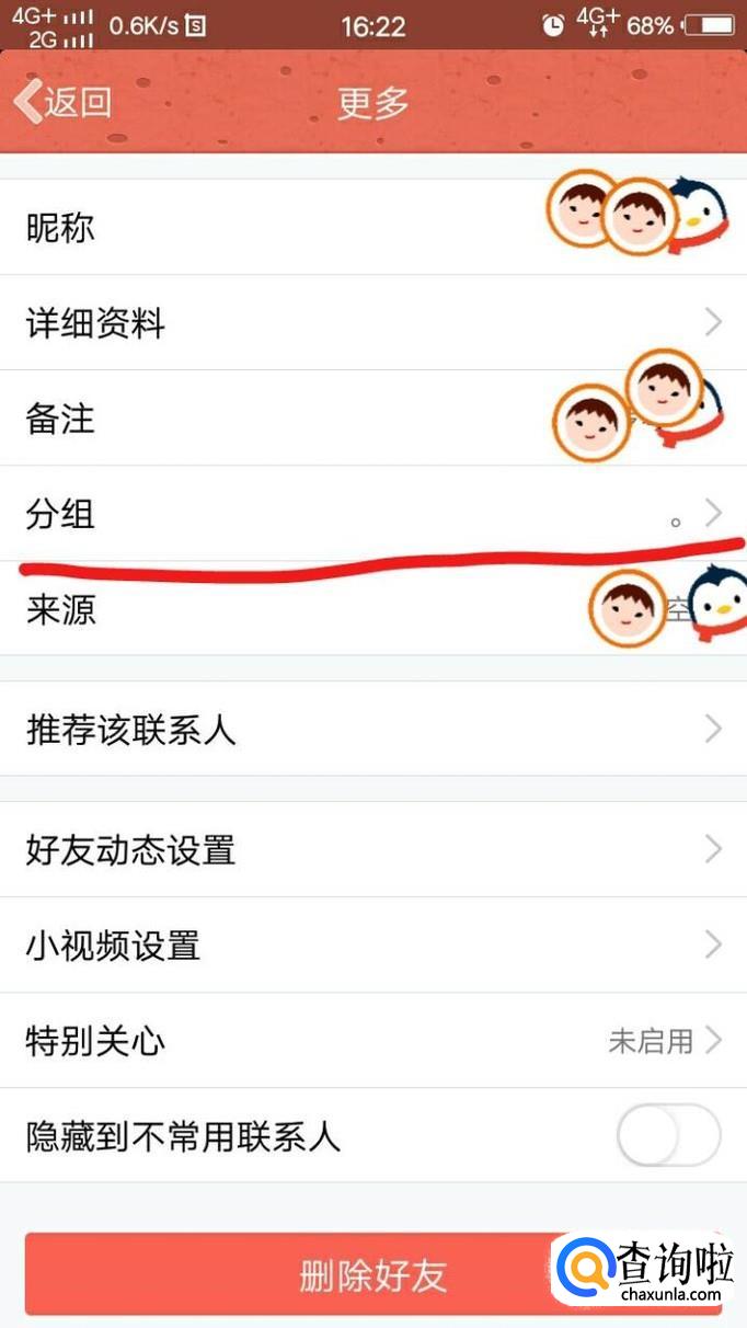 最后,我们点击“分组”。然后就会看到自己的qq分组,点击你想要将她分到哪个组就可以了。