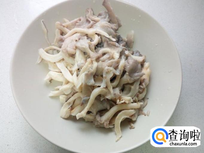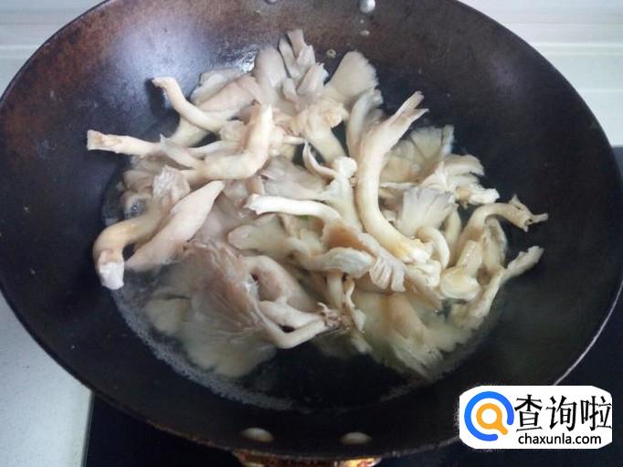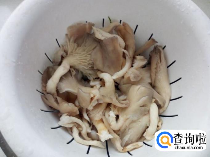 鲜蘑去根,用手掰成片,用水清洗干净。放入开水中煮两分钟捞出,用冷水过凉,沥干水分。
