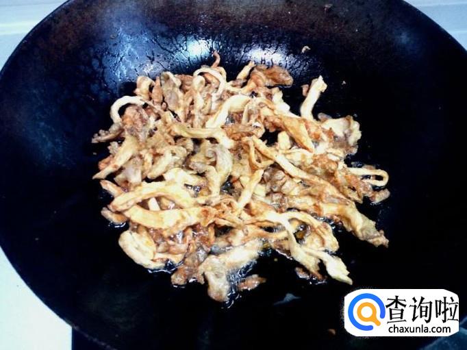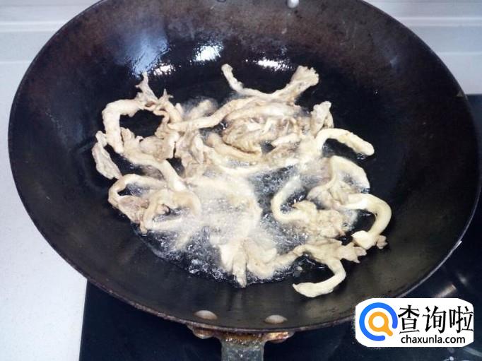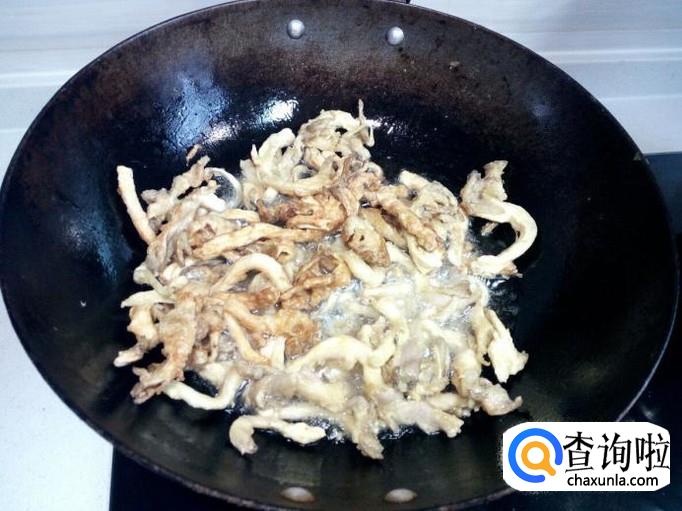 油热后,放入鲜蘑油炸,炸的过程中,把鲜蘑滑开,不要成坨(始终保持高温)。