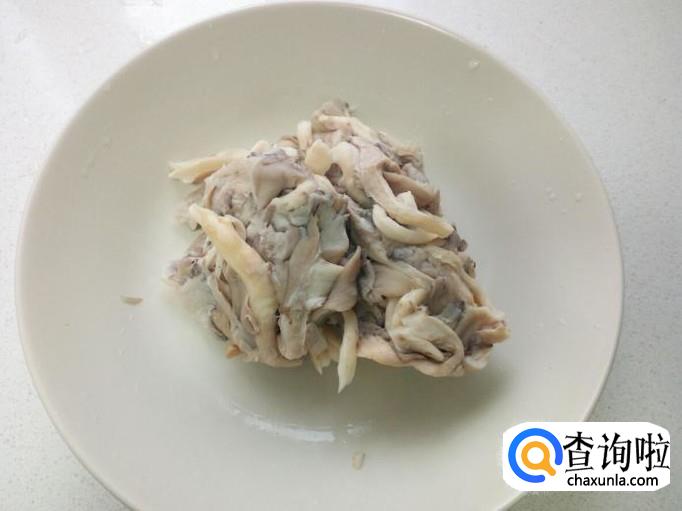 然后把鲜蘑用手撕成条,把鲜蘑里的水分,用手攥干。