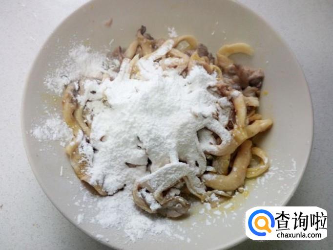 放入1:2比例的面粉,淀粉(面粉1 淀粉 2),用手抓匀,使鲜蘑挂糊,糊不要太薄,尽量厚些。