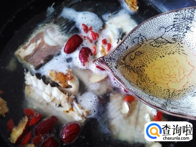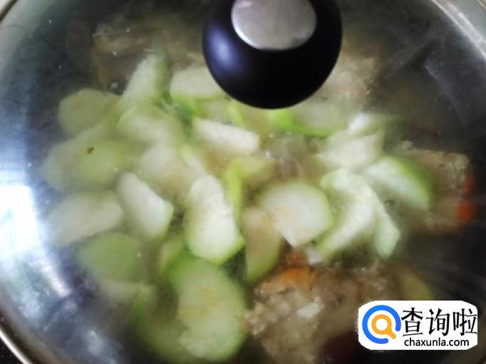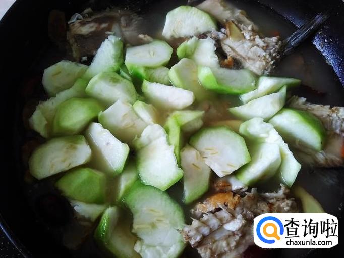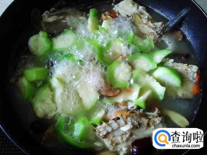 炖到汤水变成奶白色,然后加丝瓜进去,再加适量的盐。