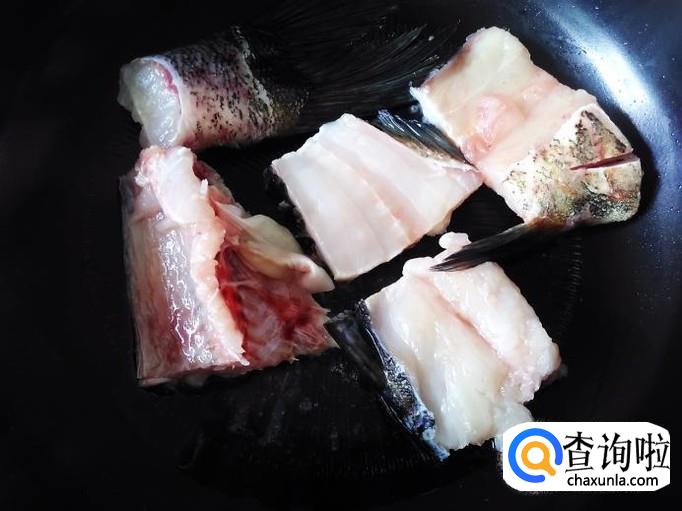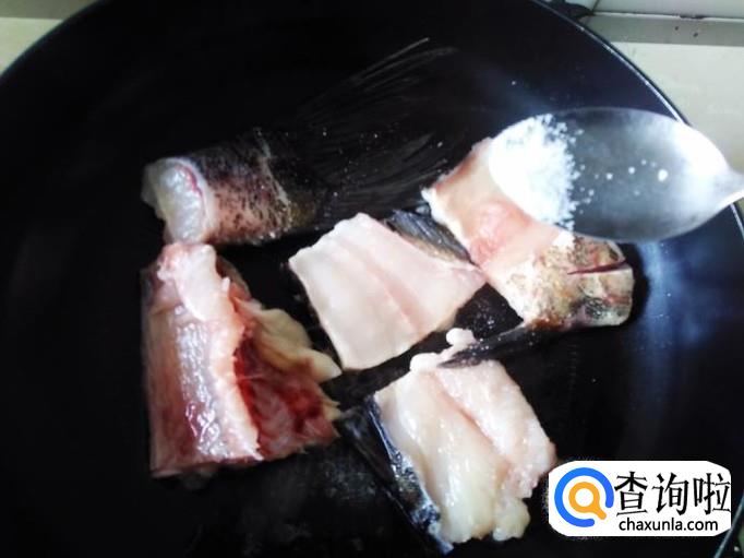 开火下油,把鱼骨摆到锅里,撒适量的盐花,用小火煎。
