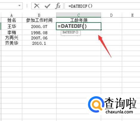 使用excel将我们的数据文件打开,然后选择单元格在单元格里输入“=DATEDIF( )”函数,如图所示: