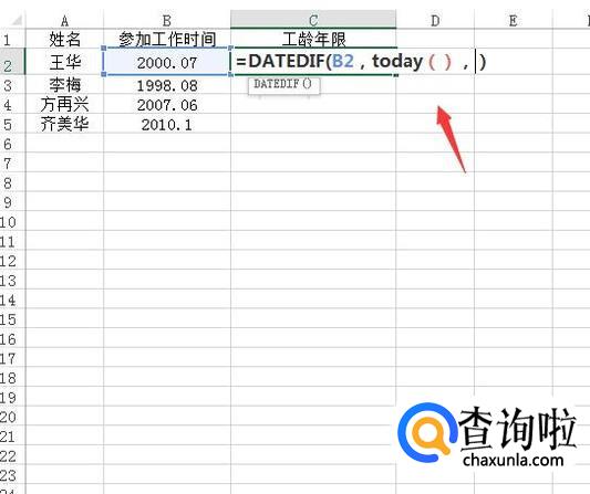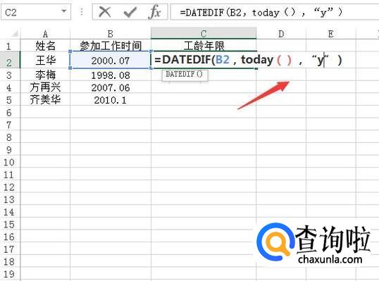 最后再在“=DATEDIF( )”函数里输入第三个参数,然后按下回车键我们就得到了计算出来的工龄年限了,如图所示: