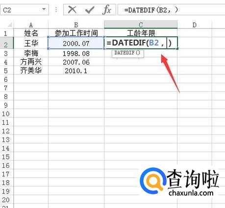 再在“=DATEDIF( )”函数内输入函数的第二个参数,然后再输入一个逗号,如图所示: