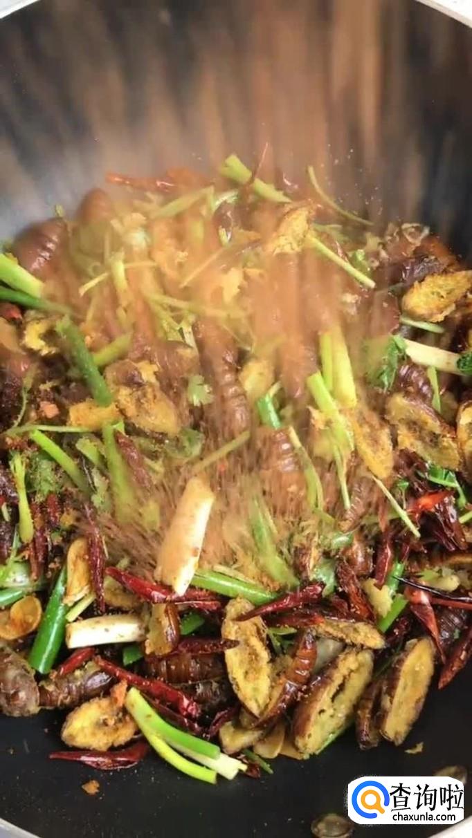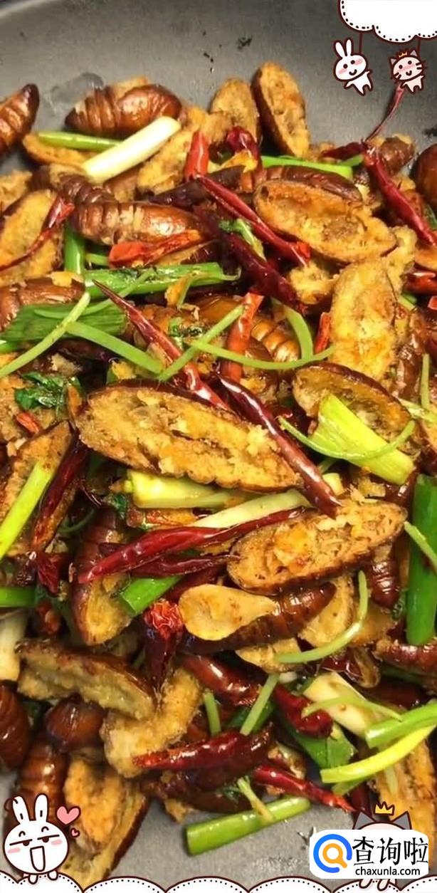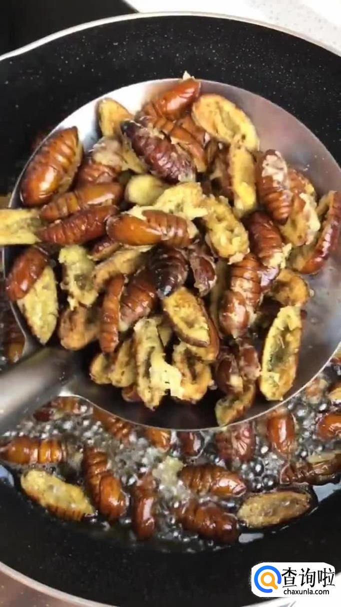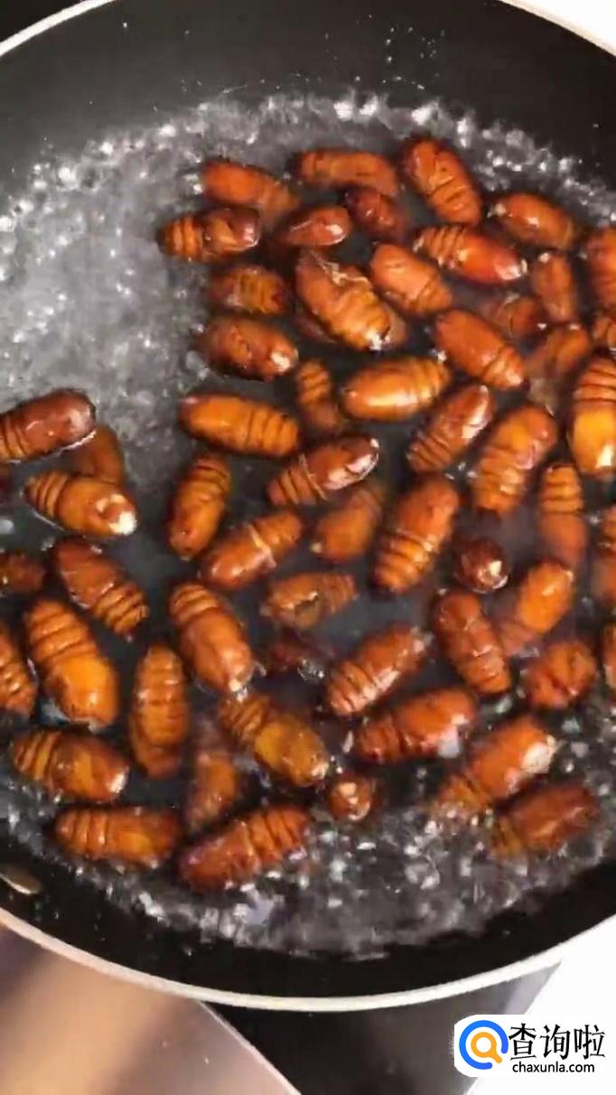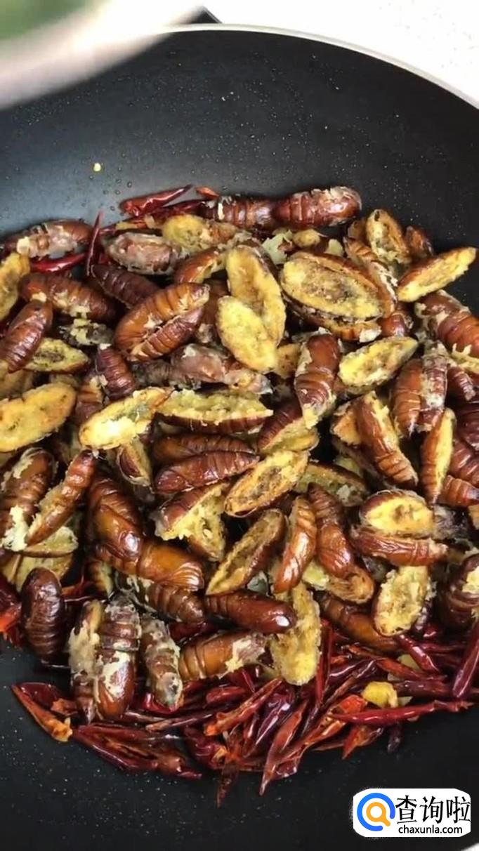 接着把炸好的蚕蛹倒入锅中翻炒三分钟,如下图所示。