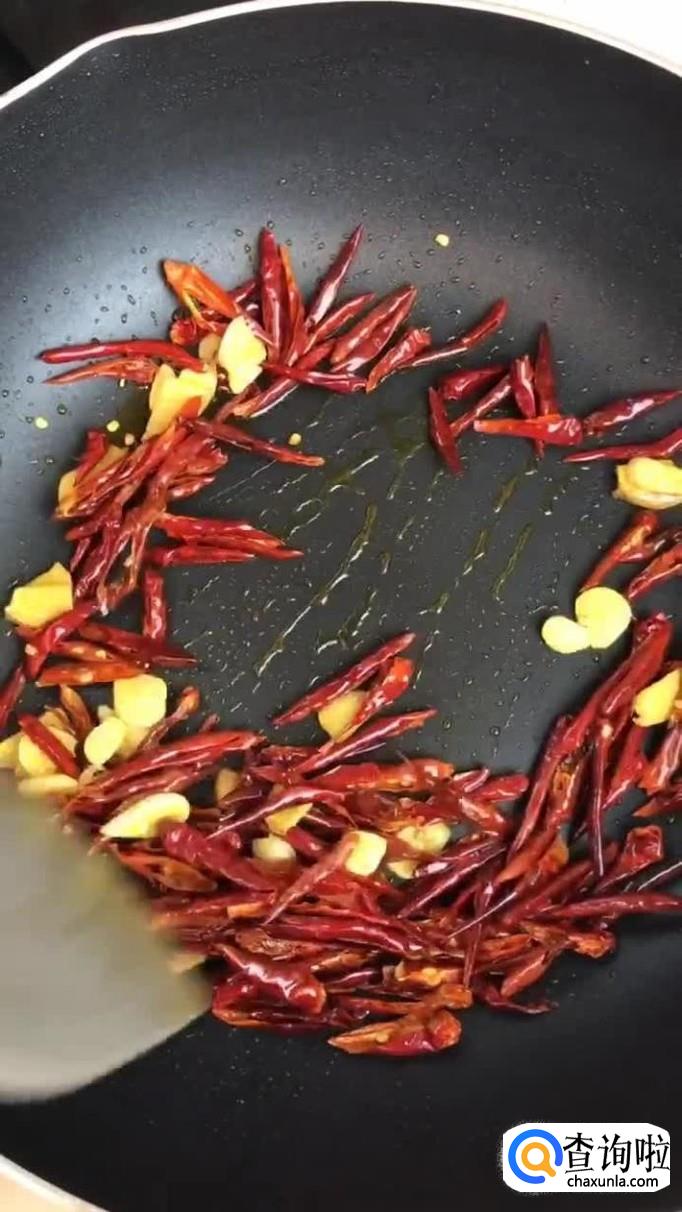 然后往锅中加入适量的食用油,待油冒烟,倒入蒜头和干辣椒爆香,如下图所示。