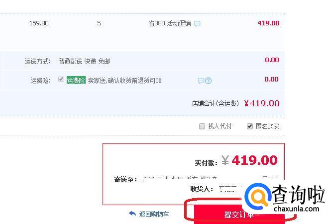 下一步是确认订单页面,我们要确认订单金额、邮寄地址及运送方式,确认完成后点击“提交订单”。