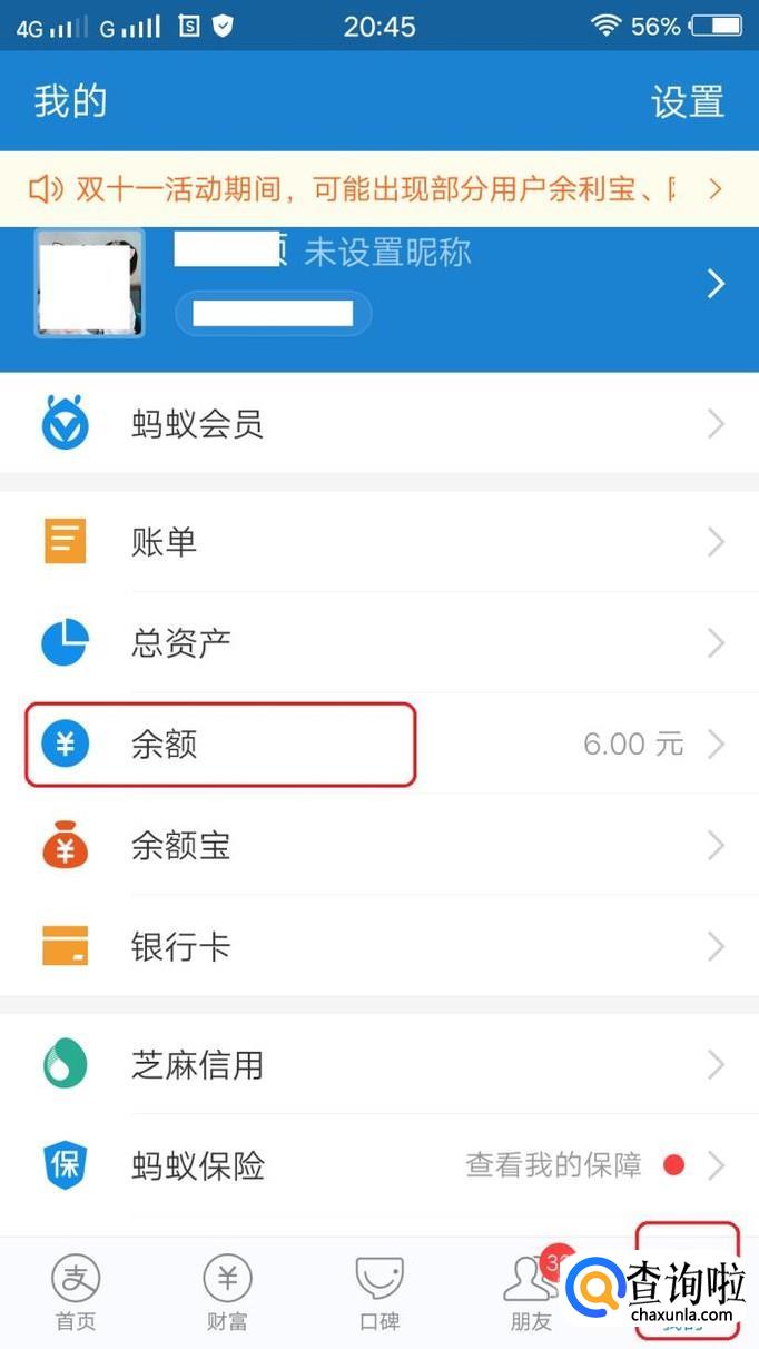 首先,我们需要知道我们有多少集分宝。最方便的方法就是打开支付宝,点击“我的”,“余额”。