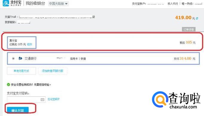 因为我们是用支付宝登录的,所以默认是用支付宝支付订单,如图所示,此时,集分宝是优先抵扣的,我们只需要支付抵扣后的余款就可以了。
