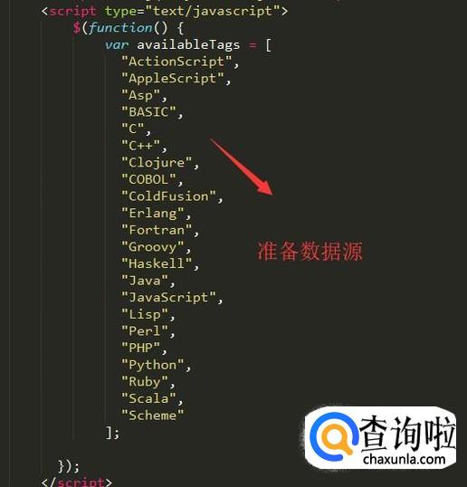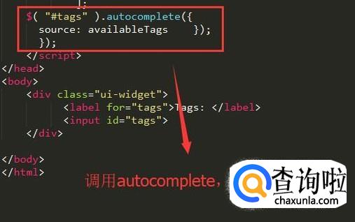 接下来就是通过autocomplete方法来进行智能提示实例化,如下图所示,注意传入数据源信息