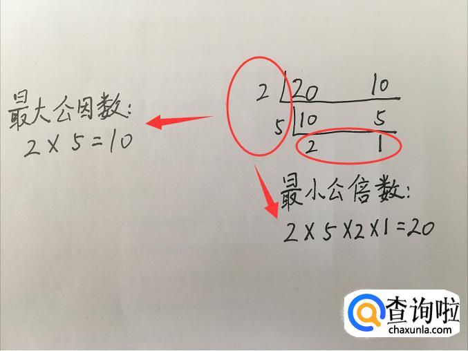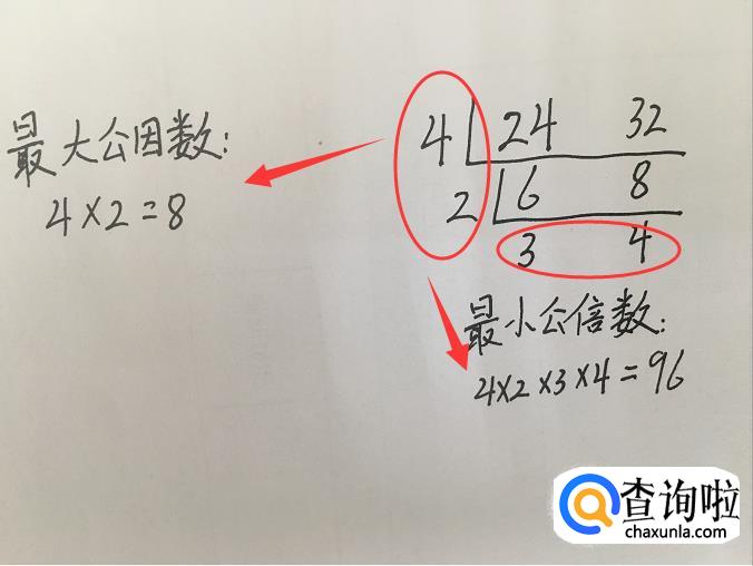 计算多的同学可以一眼看出来。短除法,先把两个要求的数列出来,然后画和除法反向的符号。左边写因数{我们所求就是最大,所以不必直接写出最大,一点点地推进才能算得准确},下面写除以左边因数后剩下的另外一个因数。如下图中:48的因数是3,剩下另一个因数就是16,12的因数是3,剩下另一个因数就是4,然后依次计算。20的因数是2,剩下另一个因数就是10,10的因数是2,剩下另一个因数就是5,第一次计算剩下的这两个公约数是5,除完之后分别剩下2和1。两个数的最大公因数就是左边的因数相乘:3×2×2=24。两个数的最小公倍数就是所有的因数相乘:3×2×2×4×1=96;同理第二个图也是这么计算。