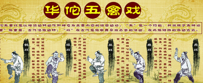 华佗五禽戏是中国民间广为流传的、也是流传时间最长的健身方法之一,由五种模仿动物的动作组成,华佗五禽戏又称“五禽操”、“五禽气功”、“百步汗戏”等。据传华佗的徒弟吴普依法锻炼,活到90多岁依然耳不聋,眼不花,牙齿完好,达到百岁高龄。