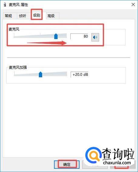 之后我们点击级别,然后我们将麦克风的音量向右滑动,这个就是增强麦克风音量的,滑动完成后,我们点击应用,然后我们点击确定就设置了。