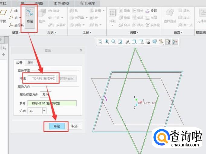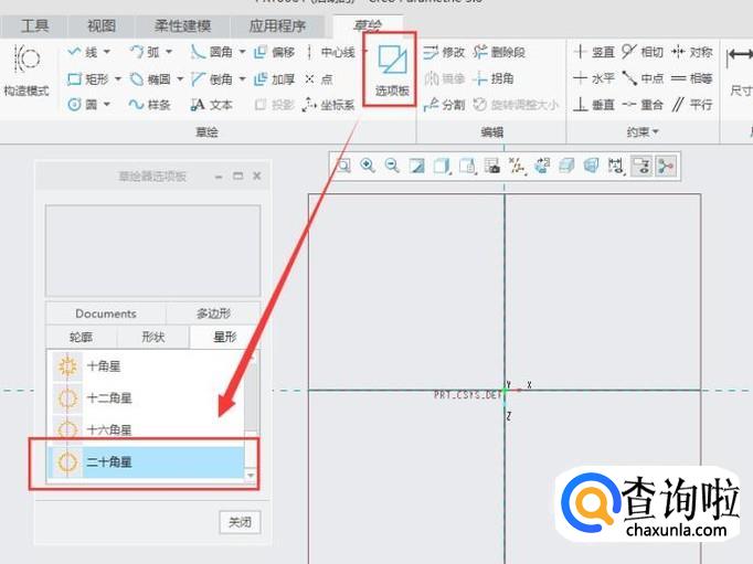 点击“选项板”,将二十角星拖至草绘平面,如图所示。