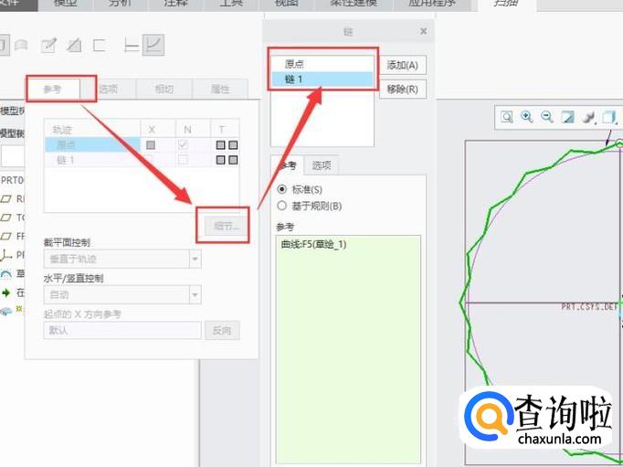 点击“参考”,然后选择“细节”,进入之后将里面的圆设置为原始轨迹,外面的二十角星形设置为辅助轨迹,如图所示。